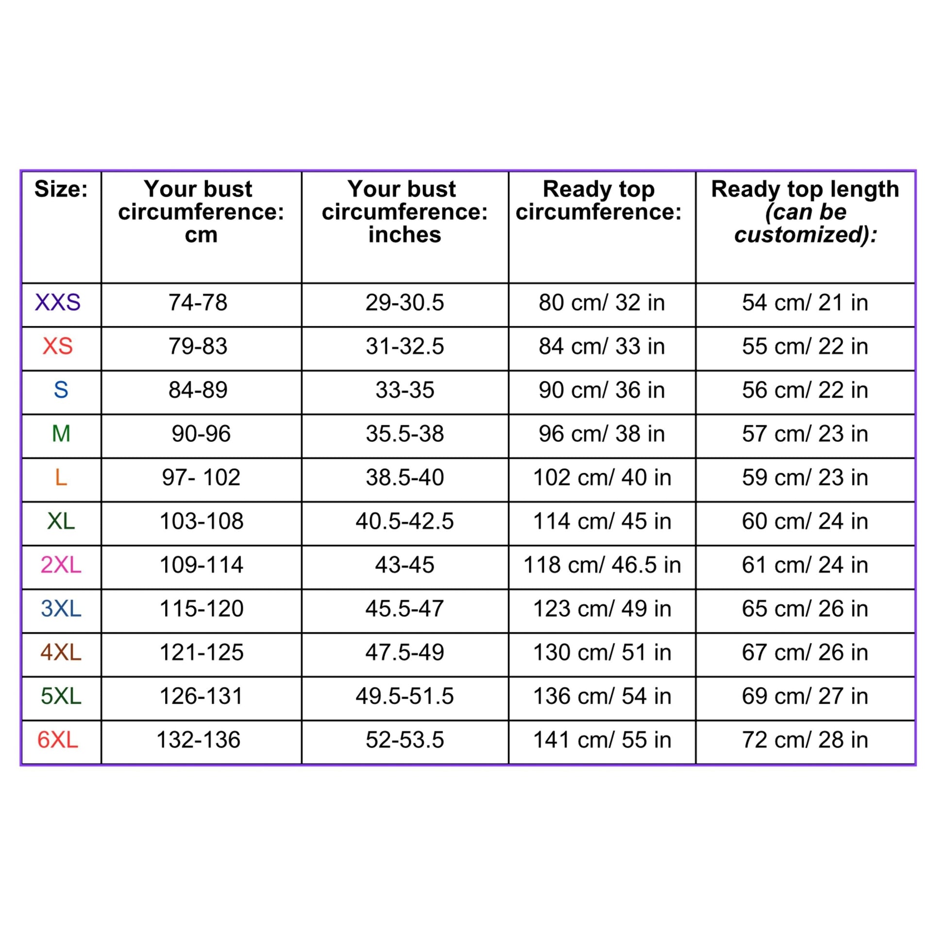 Size: There are 11 Sizes to choose from XXS, XS, S, M, L, XL, 2XL, 3XL, 4XL, 5XL, 6XL. Check out the chart on the photo to help you decide which size to choose.